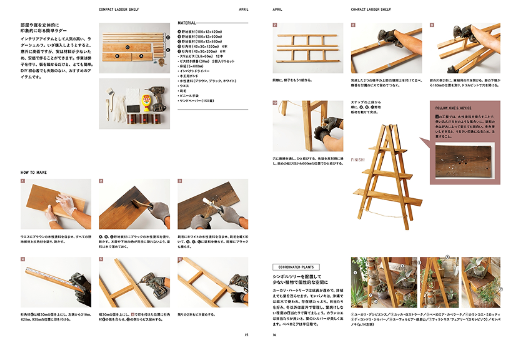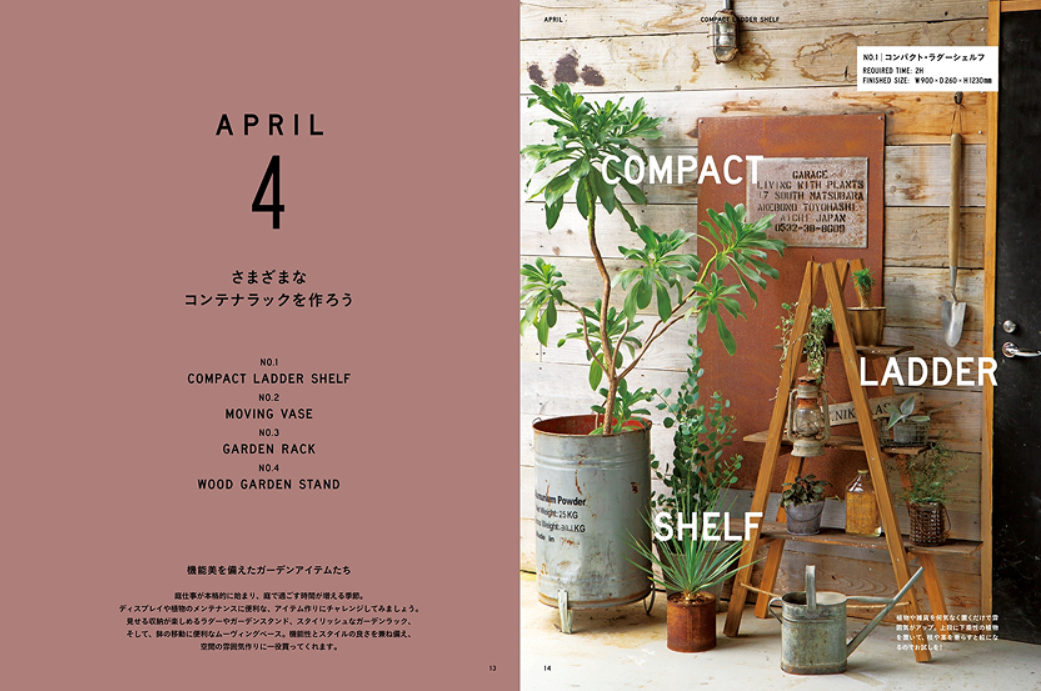월별로 만들 수 있는 47가지 DIY 가드닝 아이디어와 그린 코디네이트를 제안한다. 야외 정원 가꾸기는 물론, 실내에서도 즐길 수 있는 인도어 그린 아이템까지, 다양한 작품을 소개한다. 플랜트 테이블, 미니 그린하우스 등 최근 인기를 끌고 있는 식물 인테리어 아이템부터, 우드 펜스, 가든 타프 등 이상기후에 대응하기 위한 아이템까지, 다양하게 수록했다.
