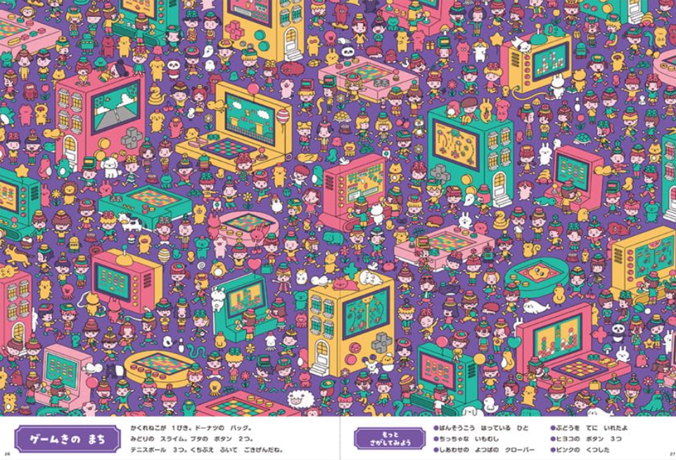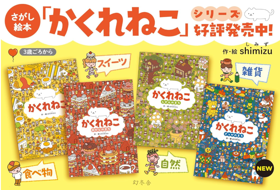인형, 스니커즈, 게임기 등 ‘잡화 & 장난감의 마을’을 무대로, 숨겨진 아이템을 찾아보자! 전설의 생물, “숨은 고양이”. 어떤 마을에든 반드시 한 마리가 숨어 있으며, 그 고양이를 찾아낸 사람에게는 행운이 찾아온다고 하는데…!? 문구의 마을, 장난감의 마을, 화장품의 마을, 도시락의 마을, 캔들의 마을 등 다양한 잡화와 장난감의 세계를 배경으로, ‘숨은 고양이’뿐 아니라 사람, 동물, 아이템들을 찾아볼 수 있다. 몰입해서 찾다 보면 자연스럽게 관찰력과 집중력이 길러진다. 아직 글을 읽을 줄 모르는 아이도 그림만 보고 즐길 수 있으며, 혼자서도, 가족이나 친구와 함께해도 신나게 빠져든다.