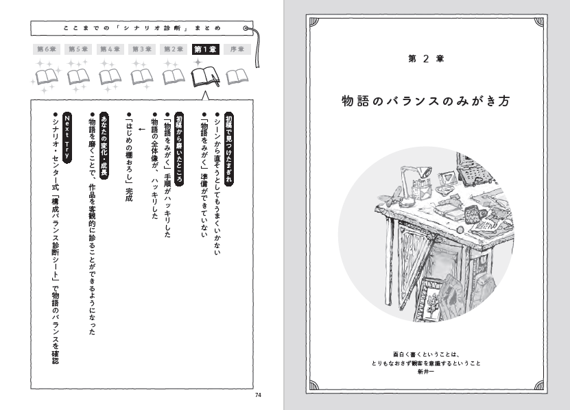 시나리오 센터 창립자 아라이 하지메가 초심자 시나리오 6,323편을 분석한 결과와 호평을 받은 작품들의 공통점을 통계화한 ‘시나리오 진단학’을 기반으로, 이야기를 더욱 재미있게 완성하는 방법을 체계적으로 설명한다. 관객과 독자가 매력을 느끼는 이야기를 만들기 위해 어떤 관점으로 보고, 어디를 점검하며, 어떻게 고쳐야 하는지 구체적으로 짚어준다. 논리적으로 나의 이야기의 ‘성장의 여지’를 찾고 다듬어 나갈 수 있다.