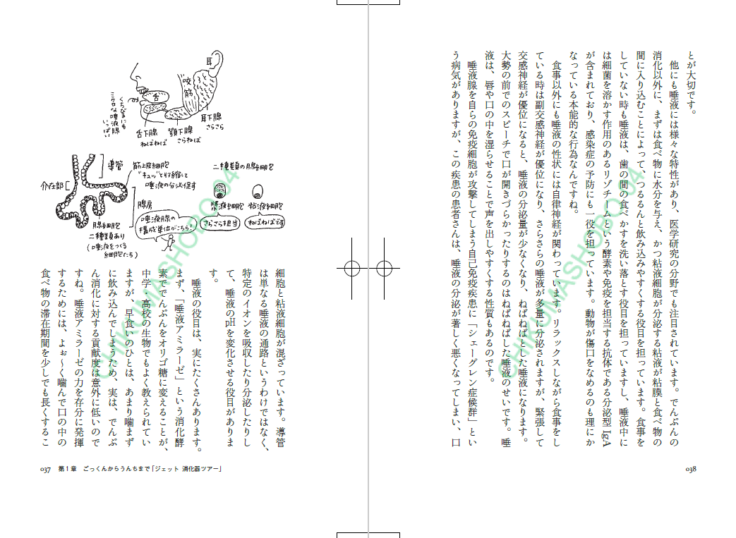 입속의 하드웨어와 소프트웨어 / 꽃봉오리 같은 ‘미뢰’가 만개한 혀 / 자동 제어 스프링클러 같은 침샘 / 크루아상도 울고 갈 다층 구조의 식도 점막 / 호화로운 2층 구조의 위 점막 / 뇌상? 망상? / 열두 손가락 길이의 십이지장 / 소화기관 외길 말고 샛길 코스로! / 만드는 것은 간, 저장하는 것은 담낭 / 꽃의 도시, 간장(肝臟) / 팔방미인 간세포 대공개! / 작은 섬들이 떠 있는 샘방(腺房)의 대해(大海), 췌장 / 물방울무늬의 멋진 리조트, 랑게르한스섬 / 집을 지을 수 있을 만큼 넓다? 회장·공장 / 위험! 장 속의 함정? / 잔을 맞부딪치는 세포들과 건배! 대장 / 다양성의 대명사, 장내 플로라 / 배 속 한 바퀴 일주, 맹장과 결장 / 하루 몇 번의 항문 근육 체조