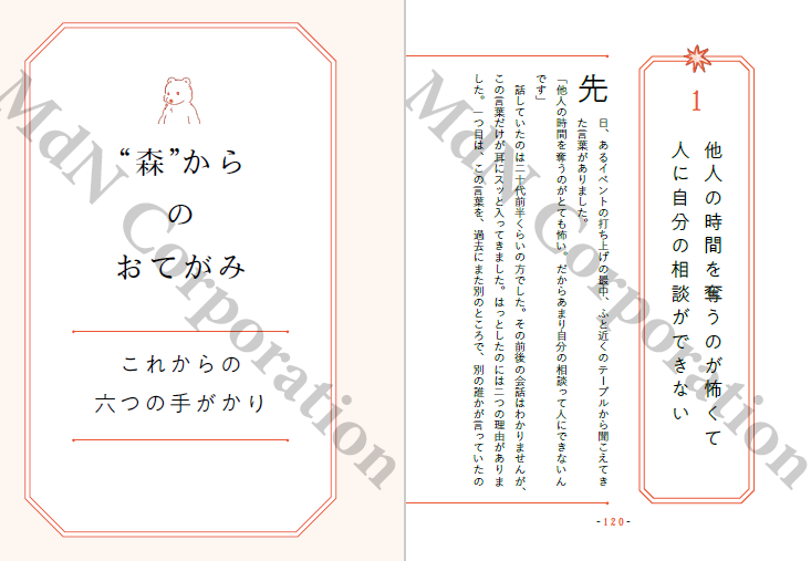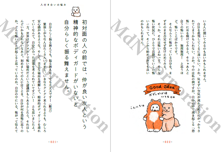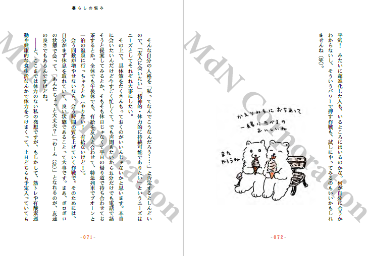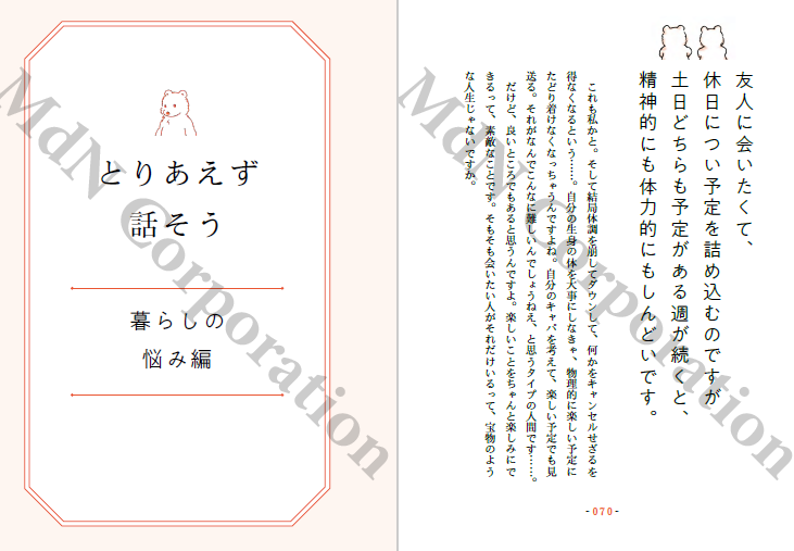 일상 에세이로 큰 주목을 받은 저자가 귀여운 일러스트와 함께, “고민을 해결하려 하지 않는” 새로운 형태의 인생 상담을 전한다. 사람 관계, 일, 생활 등 가까운 이에게는 오히려 털어놓기 어려운 고민들을 문제를 해결해야 할 대상으로 보지 않고, 독자와 대화를 나누듯 부드럽게 응답한다.