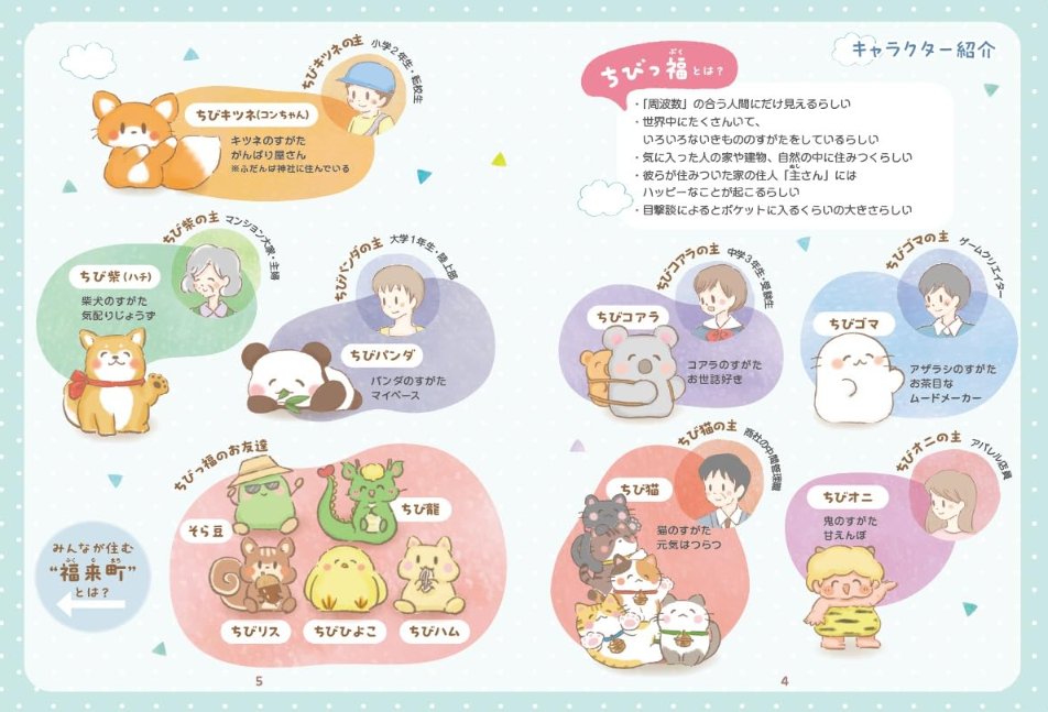 일본 어딘가에 있는 ‘복이 굴러들어 오는 마을’. 이 마을에는 손끝에 올릴 수 있을 만큼 작고, ‘주파수가 맞는 사람에게만 보이는’ 신비한 생명체 ‘꼬마 복덩이’들이 살고 있다. 물개, 코알라, 여우, 판다, 고양이 등 모습은 제각각이다. 일·공부·인간관계·연애까지, 스트레스 가득한 현대 사회 속에서 필사적으로 살아가는 사람들의 집에 꼬마 복덩이가 찾아오면, 작지만 확실한 행복을 가져다 준다고 한다.