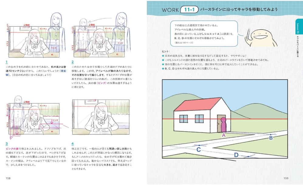 <기초편>에서는 “원근법이란 무엇인가?”라는 기본부터 시작한다. 시선 높이와 투시도법의 종류(1점·2점·3점 투시)를 상자나 방을 그려보며 이해할 수 있다. <실전편>에서는 바닥과 벽의 간격 표현, 경사로·계단 같은 구조물 그리기 등, 실제 배경 작화에 바로 쓸 수 있는 테크닉을 다룬다. ‘의도적 왜곡’ 같은 응용 기법도 소개해, 이론을 넘어 ‘실제로 그릴 수 있게’ 만드는데 초점을 맞춘다. <캐릭터편>에서는 배경 위에 캐릭터를 자연스럽게 배치하는 법을 설명한다. 시선 높이를 이해하면 키가 다른 캐릭터들도 같은 공간에서 어색함 없이 그릴 수 있게 된다. 올려다봄·내려다봄의 차이 등 캐릭터 작화에 직결되는 내용도 꼼꼼하게 담았다. |