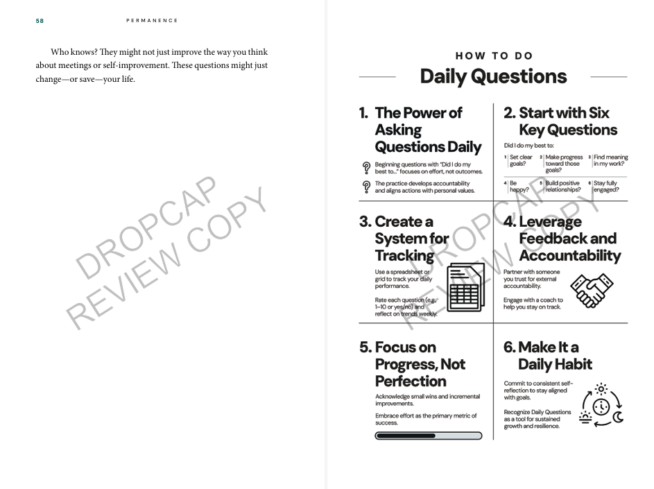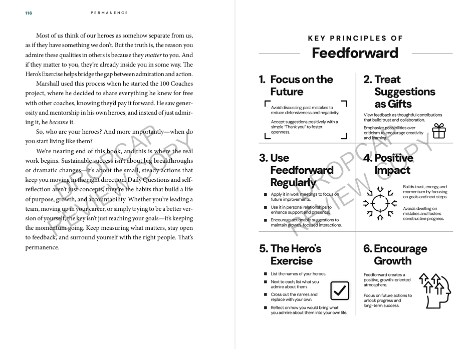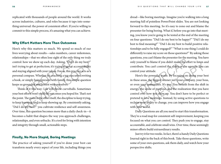 “Permanence is a clear, compelling guide to the hard—but essential—work of self-awareness, accountability, and lasting success. With practical tools like the Daily Question Process and feedforward, readers can focus on what fuels real growth: insightful reflection and purposeful action. A must-read for anyone serious about becoming—and staying—their best self.”
