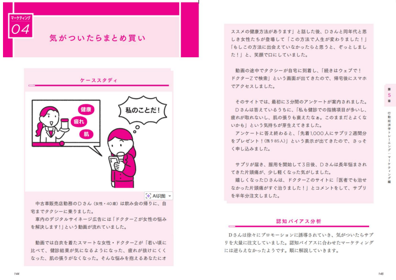 일상에서 흔히 겪는 습관 문제부터 비즈니스 현장, 마케팅, 인간관계, 사회 문제에 이르기까지 다양한 사례를 MBA식 케이스 스터디 형식으로 제시하고, 그 안에 숨어 있는 인지 편향을 짚어낸다. 나아가 ‘넛지(nudge)’를 비롯한 실천 전략을 통해 어떻게 하면 인지 편향을 극복할 수 있는지 설명한다.