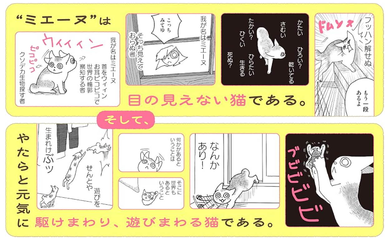 눈이 보이지 않는 아기 고양이 ‘미에누’. 앞이 보이지 않아도 세상을 향해 온몸으로 달려드는 작은 생명은 오늘도 마음껏 뛰놀고, 씩씩하게 달리다 이곳저곳에 부딪히고, 다시 아무 일 없다는 듯 일어선다. 그 앞뒤 가리지 않는 저돌적인 하루하루가 SNS 상에서 많은 이들의 사랑을 받으며, 한 권의 책으로 탄생했다.