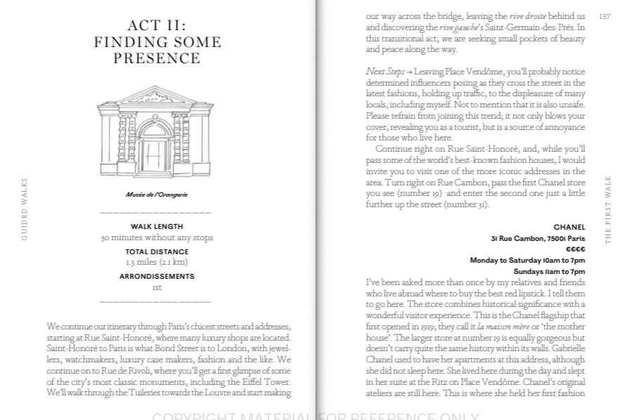 전반부에서는 혼자 여행하는 철학과 함께 파리의 주요 명소, 방문하기 좋은 시기, 교통 등 실용적인 정보를 제공한다. 후반부에서는 4가지 여유로운 산책 코스를 따라 파리를 탐험하며, 유명 명소뿐 아니라 현지인만 아는 장소와 식사, 쇼핑, 휴식 공간까지 소개한다. 세련된 디자인과 일러스트 지도, 감각적인 사진이 어우러진 이 책은 혼자서 파리의 매력을 발견하고 싶은 여성 여행자들에게 영감을 준다.